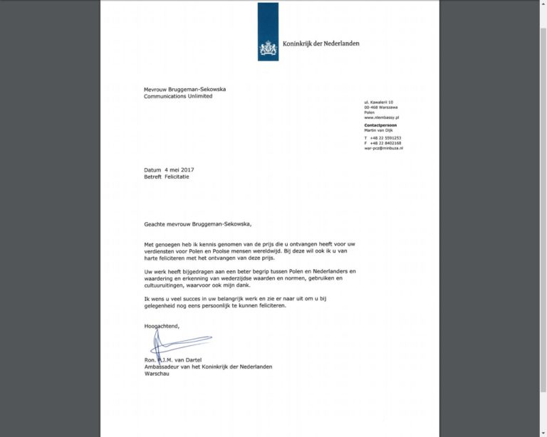 H.E. Ambassador of the Kingdom of the Netherlands in Warsaw Mr Ron J.P.M. van Dartel has congratulated us on being … Continue reading Official congratulations from H.E. Ambassador of the Kingdom of the Netherlands in Warsaw